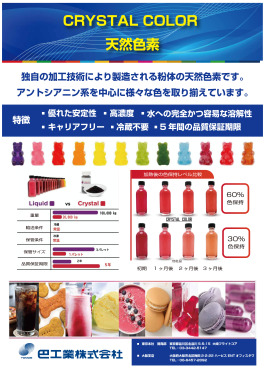 独自の加工技術により製造される粉体の天然色素です。 アントシアニン系を中心に様々な色を取り揃えています。 [製品の特徴] ◇ 優れた安定性、色保持性 ◇ 高濃度 ◇ 水への完全かつ容易な溶解性 ◇ キャリアフリー ◇ 冷蔵不要 ◇ 5年間の品質保証期限 お問い合わせ先:開発部 岡田 TEL :03-3442-5147 MAIL:gd@tomo-e.co.jp |