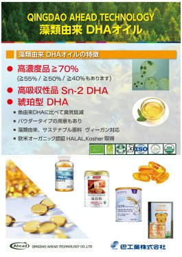 QINGDAO AHEAD TECHNOLOGY社の健康食品原料です。藻類由来のDHAオイルは魚由来のオイルに比べて臭気が低減できます。サステナブルな原料であり、ヴィーガン対応の製品に活用ができます。 その他、スピルリナ、クロレラ、小麦若葉、各種植物プロテインなどの多種多様な製品がございます。有機JAS認証やEU、 USDA、HALAL、Kosher等の認証も取得しております。別途お問い合わせください。 ◇ 藻類由来DHAオイル (≧50%品/≧40%品 ) 高濃度規格 ≧70%品 藻類由来DHAオイルパウダー (新製品) 高吸収性品 Sn-2タイプ (新製品) 琥珀型タイプ [その他の製品] ◇ スピルリナ パウダー ◇ スピルリナ 青色素 ◇ クロレラ パウダー ◇ 有機 抹茶 パウダー ◇ 有機 小麦若葉 パウダー ◇ ルテイン ◇ 玄米プロテイン パウダー ◇ かぼちゃの種プロテイン パウダー ◇ アーモンドプロテイン パウダー 詳細はこちら お問い合わせ先:開発部 岡田 TEL :03-3442-5147 MAIL:gd@tomo-e.co.jp |